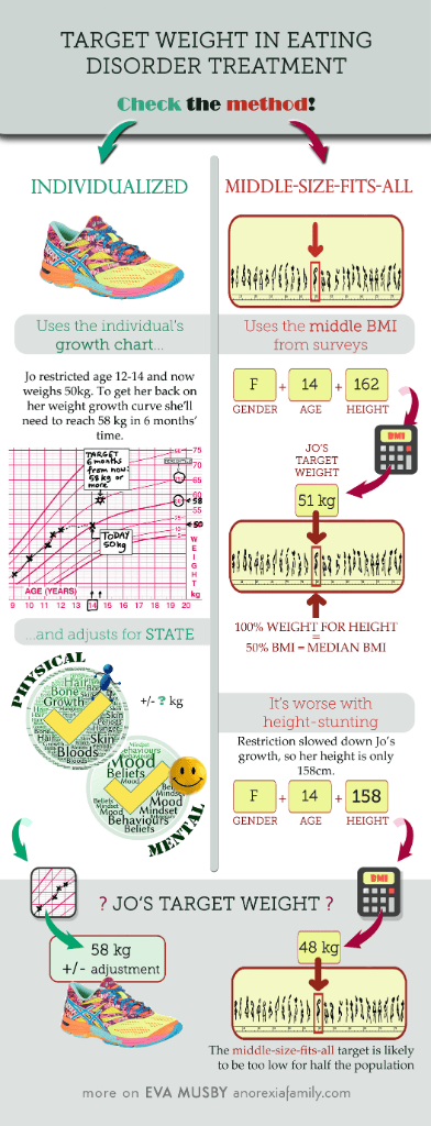 The kids who are in danger are those who need to track at a higher BMI. With the middle-size-fits-all method, the weight target is a gift to their eating disorder.